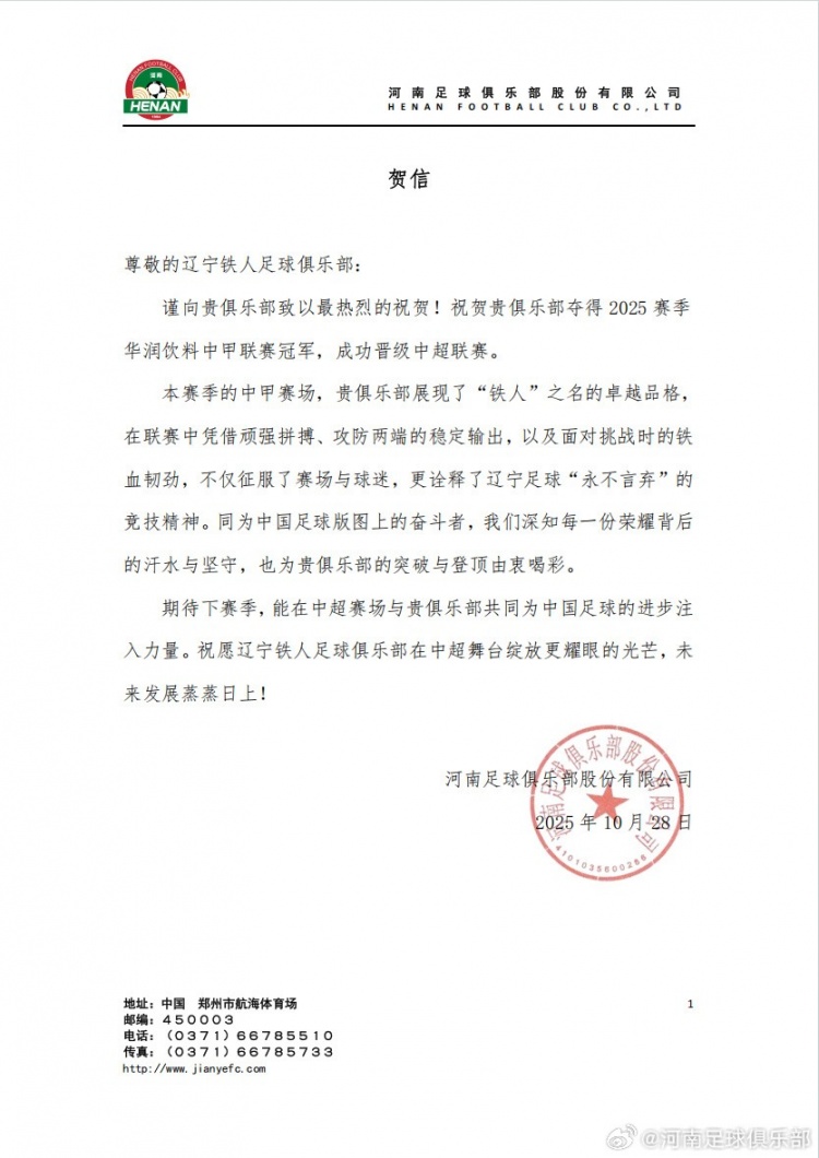 河南俱乐部祝贺辽宁铁人夺得2025赛季中甲第一名 ,成功晋级下一轮 中超职业联赛