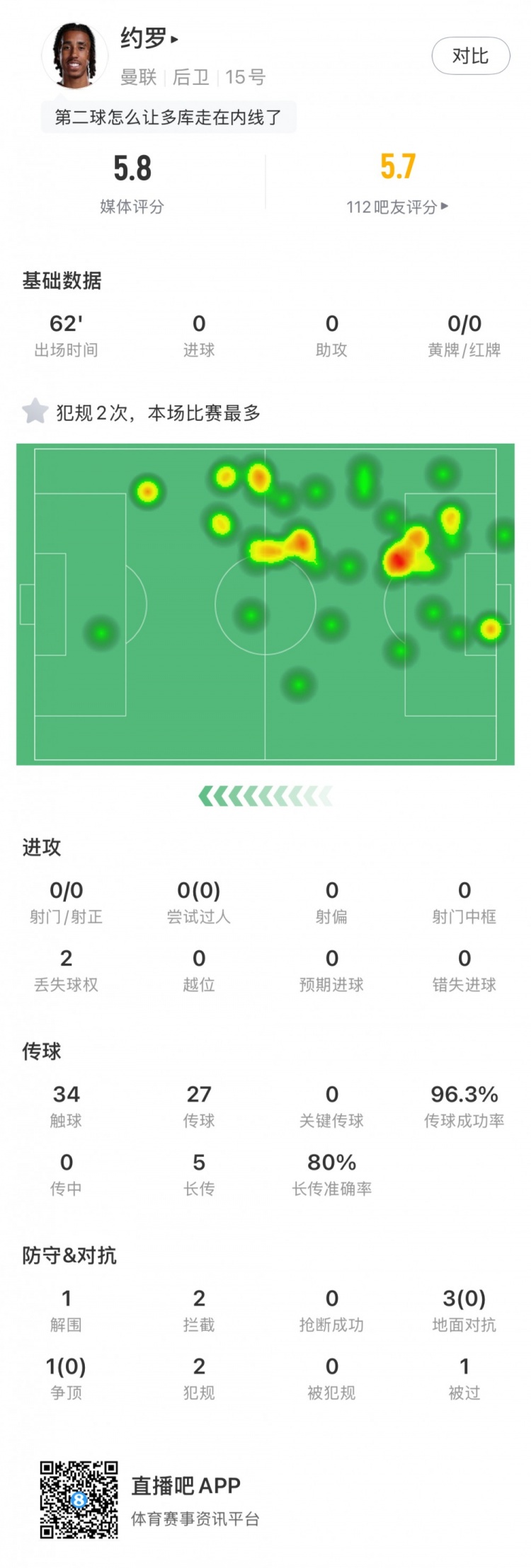 9月15日讯 英超第4轮曼市德比,曼联后场球员约罗杆位出战62分钟,球员本场数据如下: