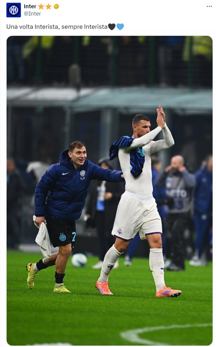 国米旧将哲科此役为佛罗伦萨后备 出场,国米官方社媒晒出哲科的照片,致敬这位39岁的前场球员,苏超直播配文:“一日蓝黑,终生蓝黑。”