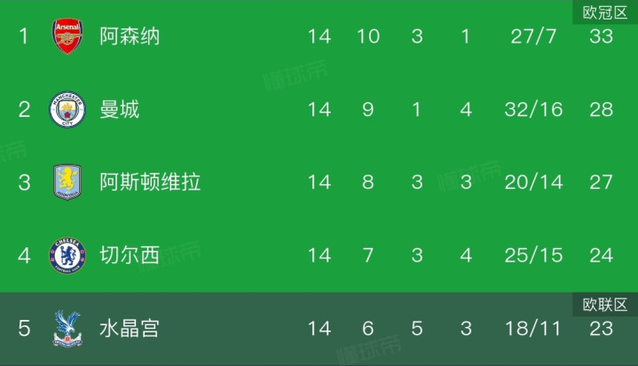随着本轮赛事 的结束,积分榜也再度发生了变化。其中阿森纳凭借开赛以来展现出的强大角逐 力,稳坐积分榜第一,领跑 排名第二的曼城多达5分,在他们后面是阿斯顿维拉和切尔西等队,他们也是本赛季欧冠名额的强劲 争夺者。