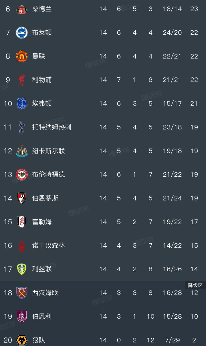 而蝉联第一名 第一名 利物浦则是滑落到了第9,开赛以来他们仅仅获得了7场获胜 。而在降级区的三队分别是积12分的西汉姆联、积10分的伯恩利,以及排名垫底,仅仅获得2分的狼队,他们和榜首的分差已经拉大到了31分。