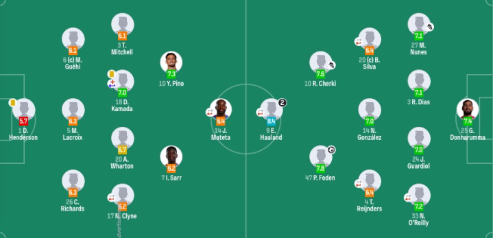 曼城杆位:25-多纳鲁马、27-努内斯、3-鲁本·迪亚斯、24-格瓦迪奥尔、33-奥赖利(91'21-努里)、14-尼科、20-B席(91'82-刘易斯)、4-赖因德斯(85'26-萨维尼奥)、47-福登、10-谢尔基、9-哈兰德(91'7-马尔穆什)