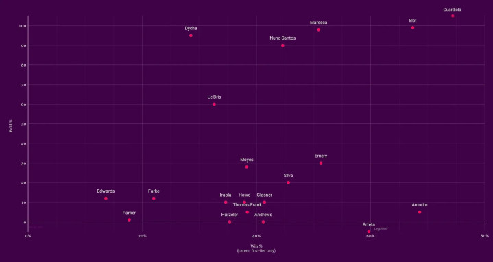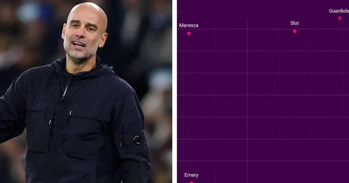 如果只看现役英超主帅,并且限定在顶级职业联赛 执教胜率这个维度,瓜迪奥拉站在最顶端。