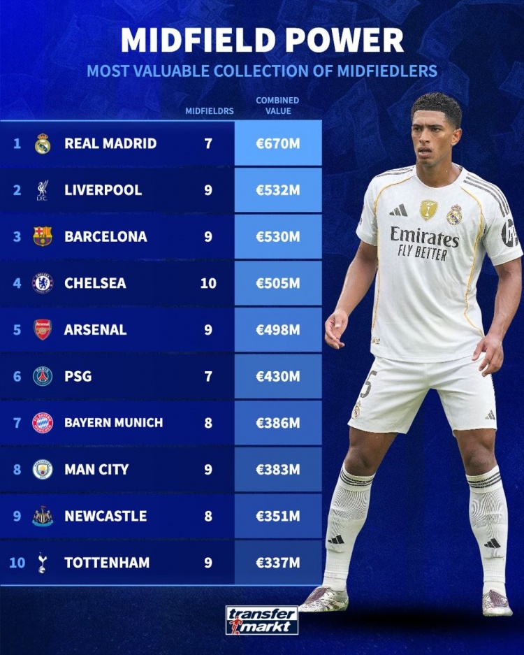 9月25日讯 日前,德转统计了各队中场球员球员总身价排行,皇马7名中场球员总价6.7亿欧居首。