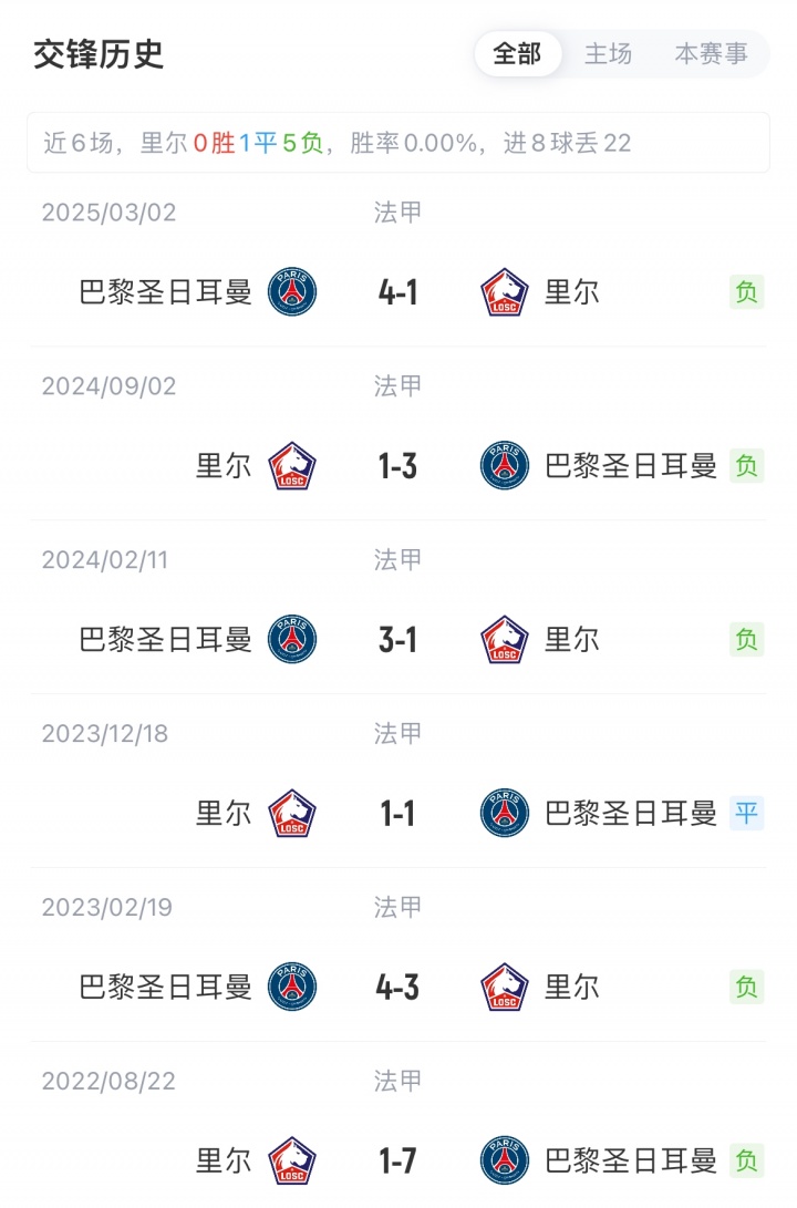 巴黎职业联赛 5胜1负积15分,苏超直播近期各赛事2连胜;里尔3胜1平2负积10分,职业联赛 遭遇2连败。巴黎对阵里尔已连续8场不败(7胜1平)。