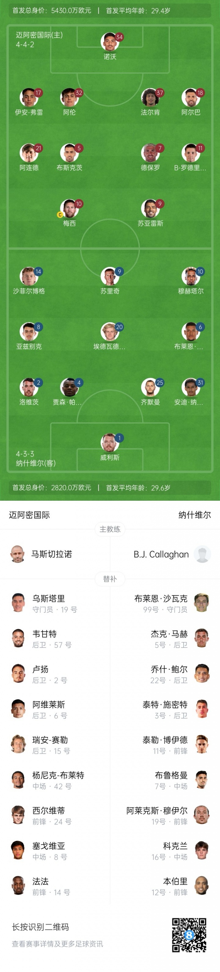 季后赛-迈阿密vs纳什维尔杆位:梅西领衔,苏亚雷斯、德保罗先发