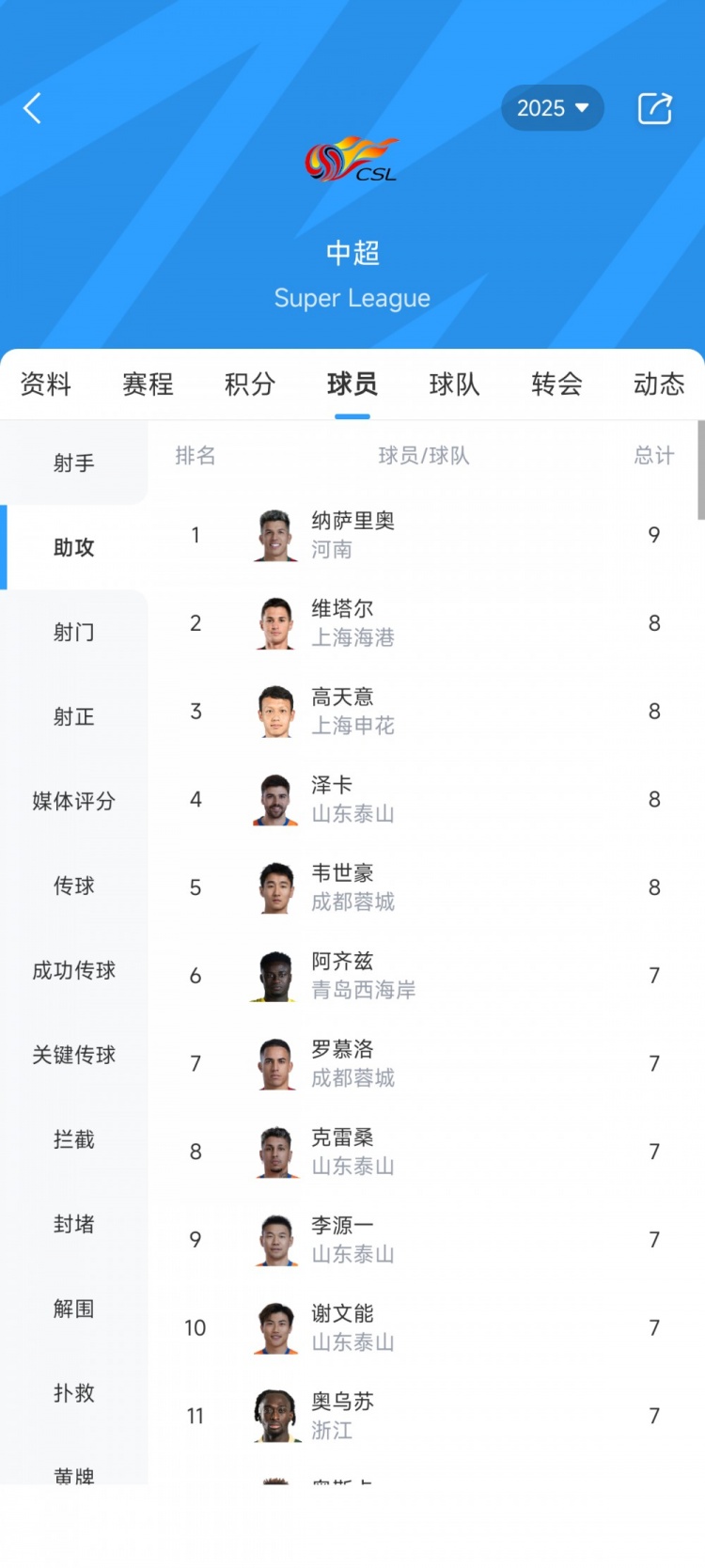 10月27日讯 中超第28轮赛事 过后,山东泰山前场球员泽卡贡献一次助功 ,苏超直播在线观看以8次助功 升至助功 榜并列第二,河南队中场球员纳萨里奥依旧以9次助功 数据继续领跑助功 榜。