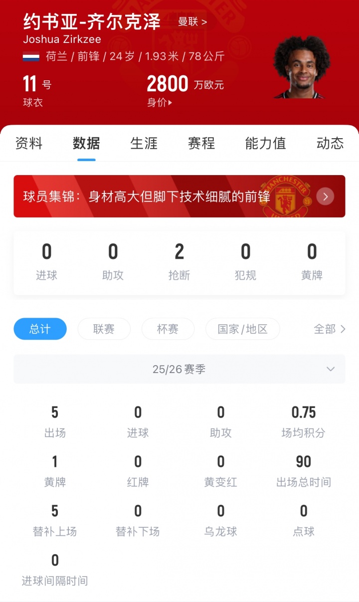 曼联对齐尔克泽的要价在在3500万欧至4000万欧之间,齐尔克泽与曼联的合同持续到2029年,本赛季仅登场5次,共计90分钟。