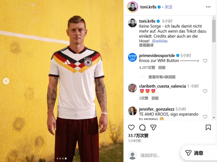 11月7日讯 德国足坛传奇克罗斯已经宣布退役,但他在社交媒体上依然非常活跃。